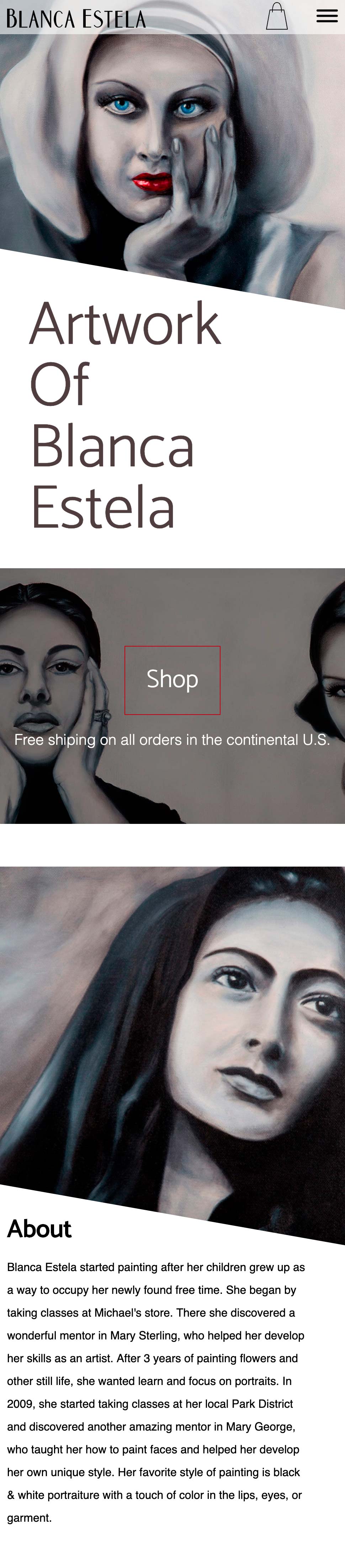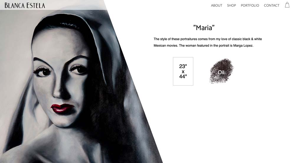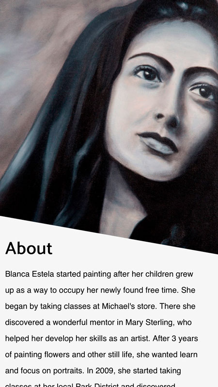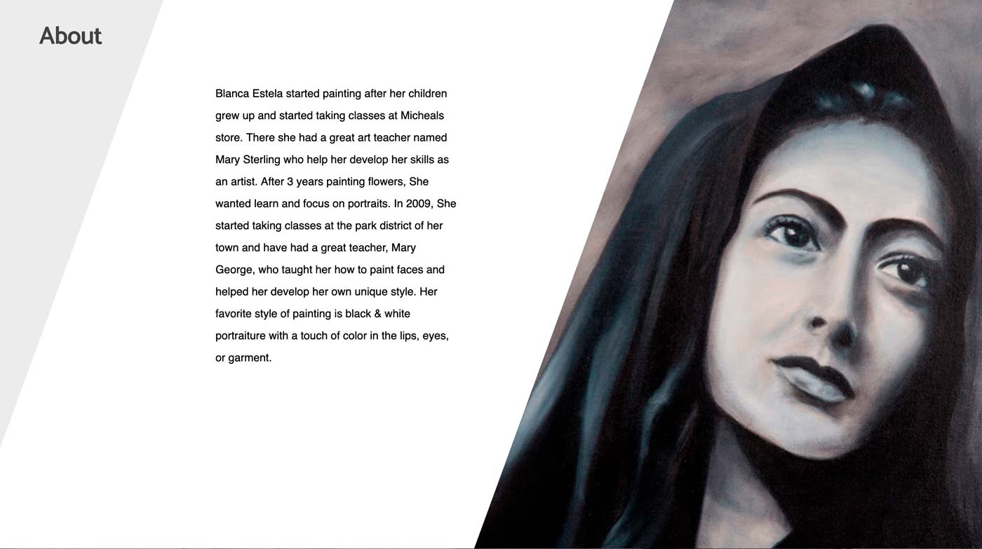 Blanca Estella is an artist from Chicago, IL. As the quality of her skills improved over time, more people noticed and inquired about her work. Requesting a portfolio website to showcase her best work, but also offer them for sale as well. To truly showcase her incredible work, higher quality photos were needed with a photo shoot of all her paintings Along with the website, business cards, exhibition flyers, and shipping materials were also requested.