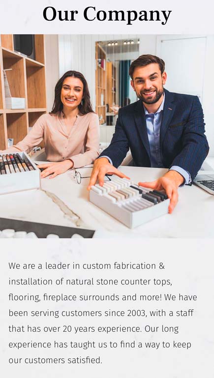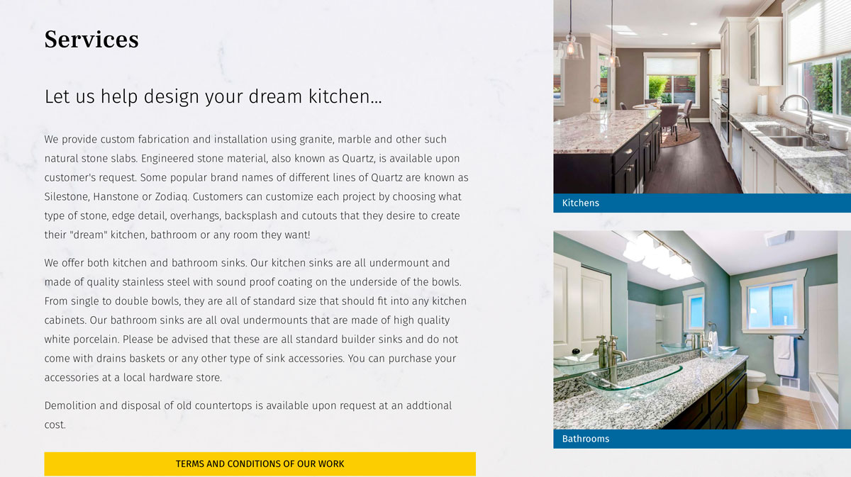 The redesign was to incorporate granite subtly throughout the site and keep it light and clean. It was important to move all the elements from the previous site into a layout that fit the new aesthetic. The strong brand colors help call attention to any important clickable links.