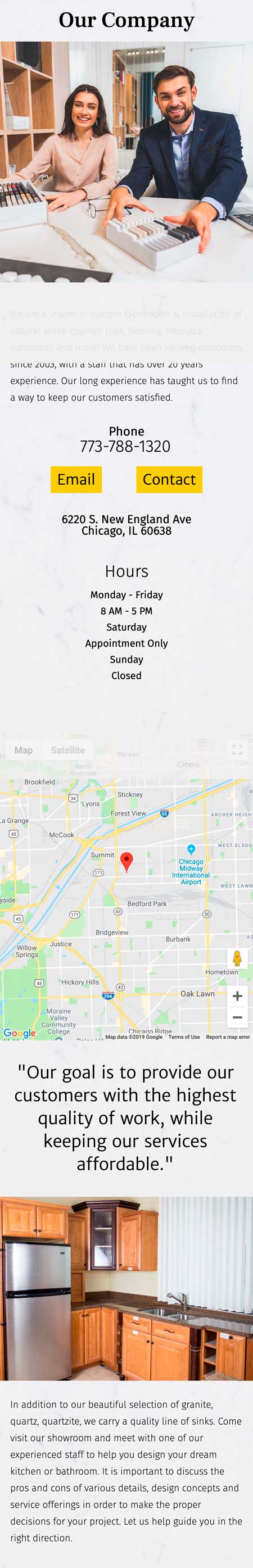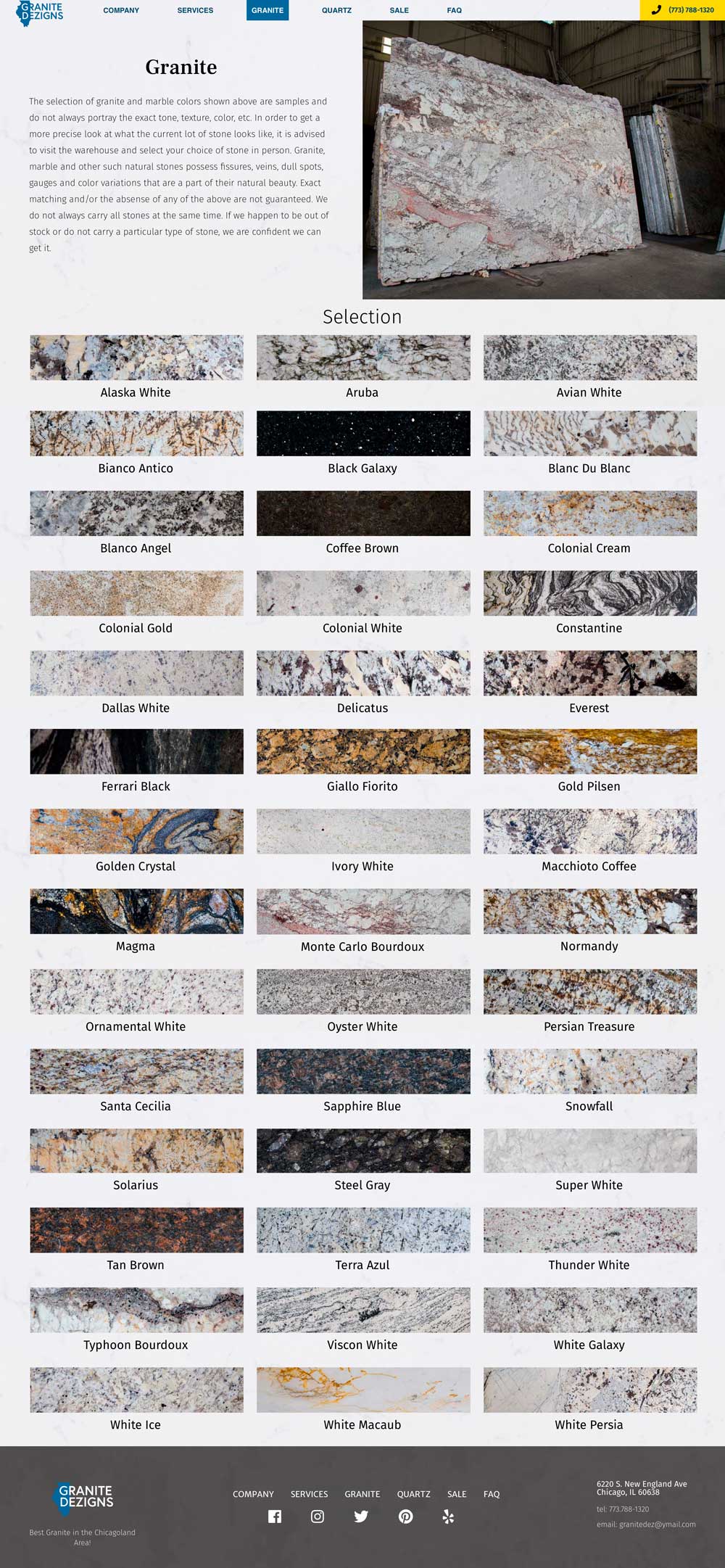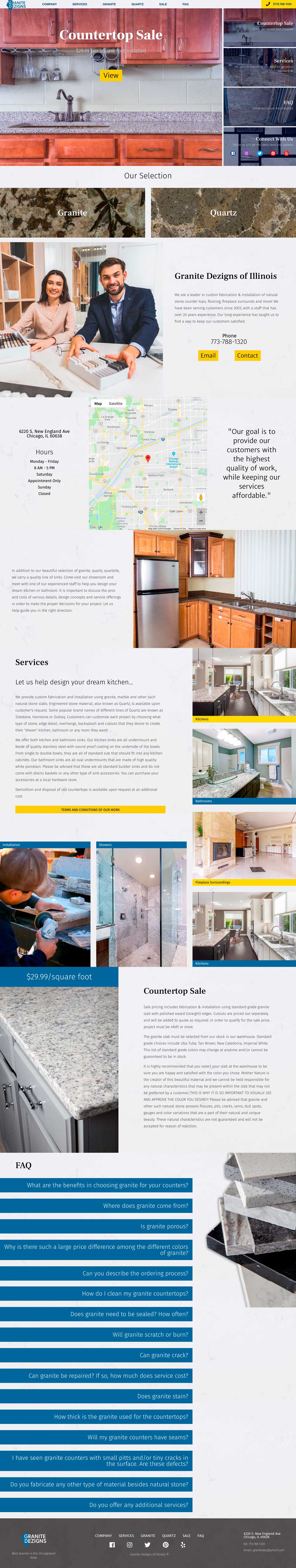 Granite Dezigns of Illinois is a granite fabricator in Chicago, IL. Frustrated with their previous site and developer, their need was for an updated redesign and cost-effective hosting with open communication with the developer. Photography was also needed for their selection of stone, which took place in their warehouse. Marketing materials such as business cards, brochures, and ads were requested to coincide with the new website.